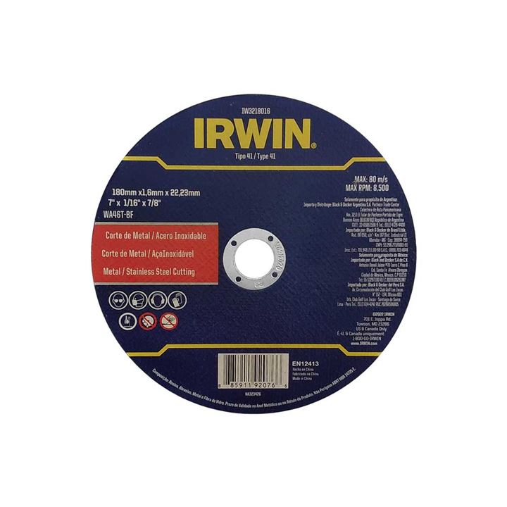 DISCO DE CORTE IRWIN INOX 7.1/16 -180MM X 1,6MM X 22,2MM