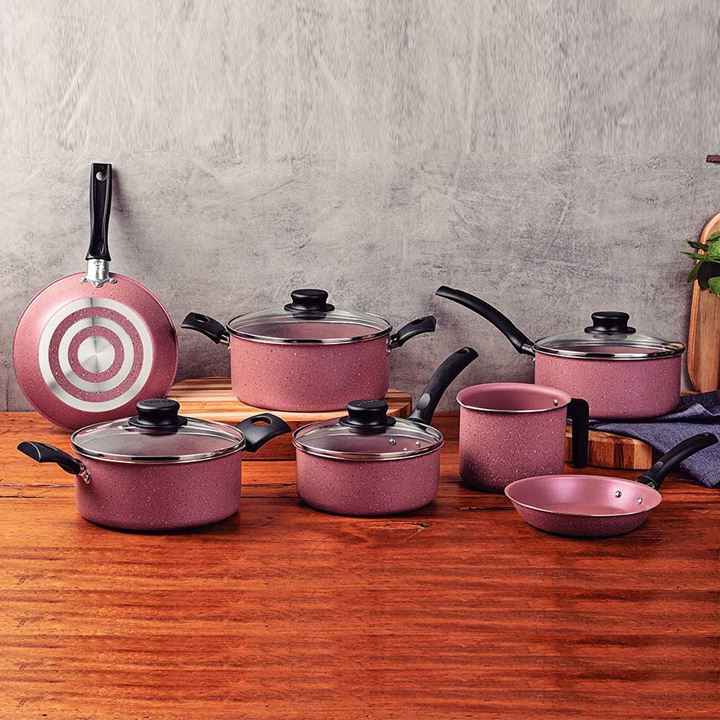 JOGO DE PANELAS TRAMONTINA TURIM EM ALUMINIO COM REVESTIMENTO INTERNO E EXTERNO EM ANTIADERENTE STARFLON MAX ROSA 07 PEÇAS
